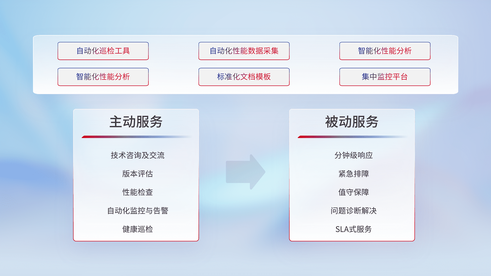 智能化工具和标准化文档,,,,保障服务质量,,,提供主动服务(包含技术咨询、、、、版本评估、、、性能检查、、自动化监控与告警、、健康巡检)和被动服务包含(分钟级响应、、、紧急排障、、、值守保障、、、、问题诊断解决、、、SLA服务)。。